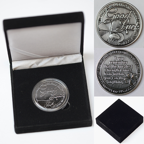 Good Luck Medallion in gun metal finish in black velvet presentation box for matric; exams or any new venture such as new job, new journey, etc.