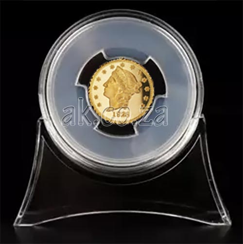 45mm coin capsule with 39mm clear insert and display stand.