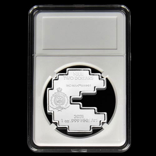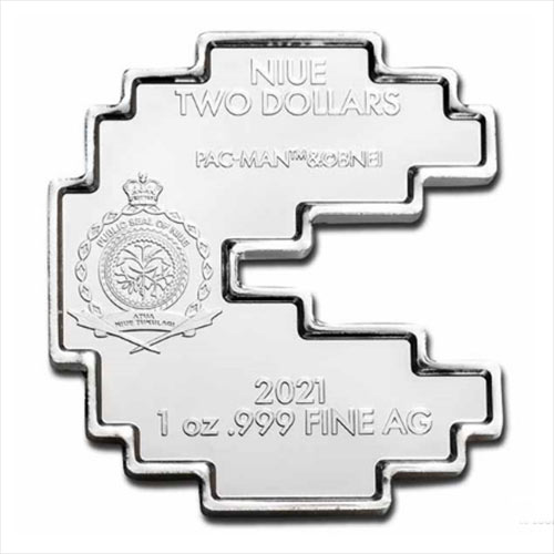 Uniquely shaped 2021 1oz .999 Silver PAC-MAN™ coins.