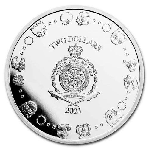 Obverse: Displays the Niue coat of arms along with the face value and year of issue surrounded by officially licensed Ms.PAC-MAN™ sprites from the original 1980s classic arcade game.