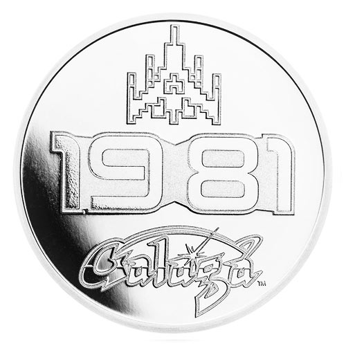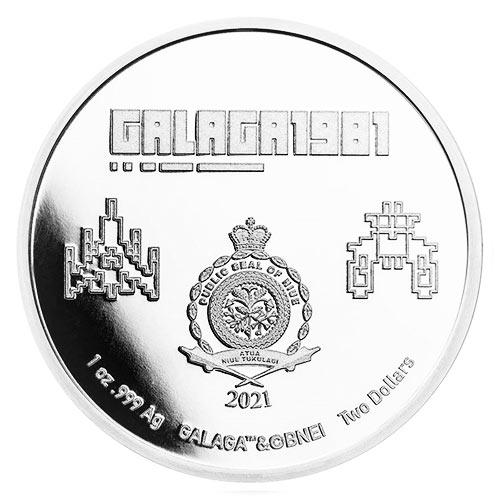Obverse: “Galaga1981” with two spaceships, the seal of the country of Niue, year, silver contents, face value and copyright information.