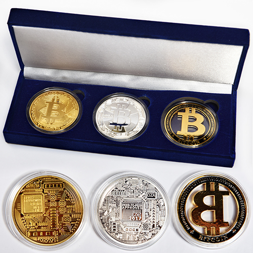 3 coin gold plated, silver plated and cut out bitcoin set in blue velvet presentation box