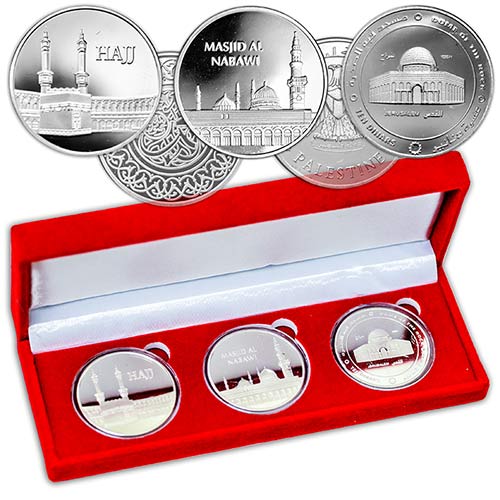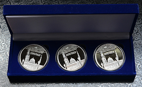 3 Masjids 1oz silver plated 40mm Islamic medallion set in velvet box.