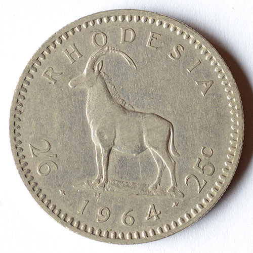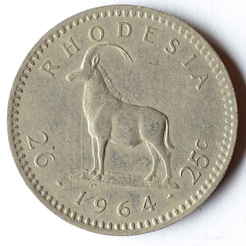 1964 Rhodesia 25c curpo-nickel 14g 32.3mm 2.5mm thickness Elizabeth II 2nd portrait